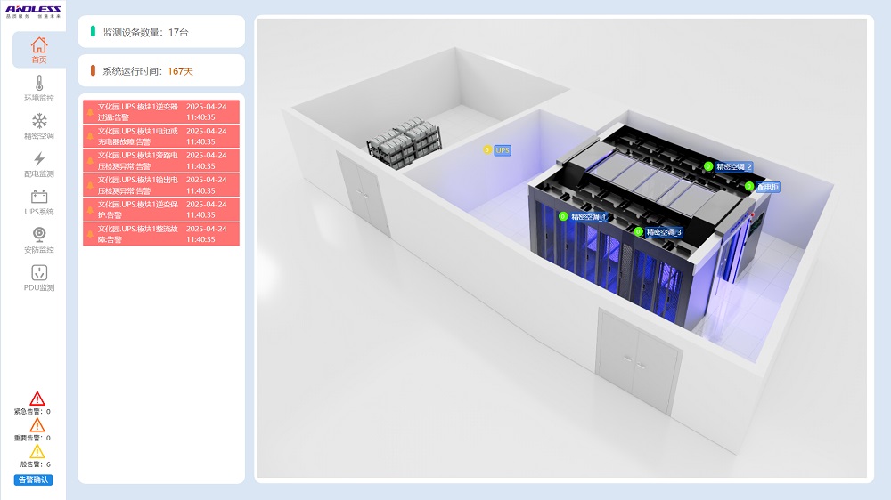 本次榮幸為研究院機(jī)房項(xiàng)目提供一套安德力士品牌微模塊通道機(jī)房設(shè)備,涉及系統(tǒng)有:機(jī)柜、精密空調(diào)(基站精密空調(diào)、列間精密空調(diào))、精密配電、動(dòng)力環(huán)境監(jiān)控系統(tǒng)。