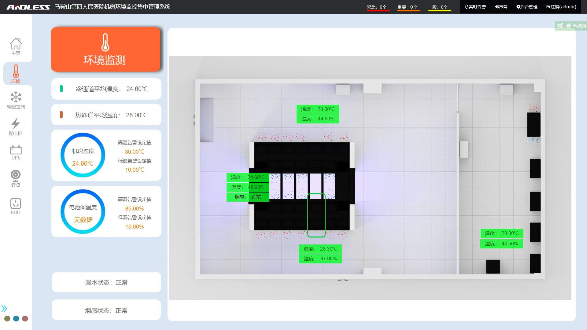 動環(huán)監(jiān)控系統(tǒng):本次主要是針對UPS、溫濕度、精密空調(diào)、漏水、煙感等設(shè)備進(jìn)行監(jiān)控項(xiàng)。當(dāng)系統(tǒng)檢測到的數(shù)據(jù)超過用戶設(shè)定的上限或是下限時,可根據(jù)用戶需求短信、語音報警、聲光報警、WEB彈窗、郵箱等多種方式發(fā)送告警信息通知相關(guān)人員,及時處理異常問題