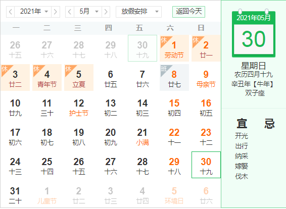 “五一”國(guó)際勞動(dòng)節(jié):5月1日-5日放假,共5天。5月8日(星期六)正常上班。