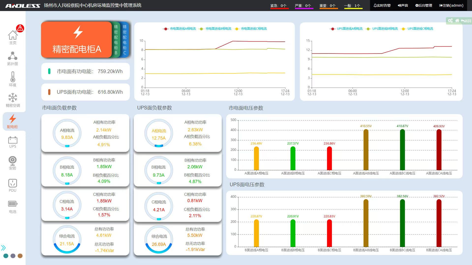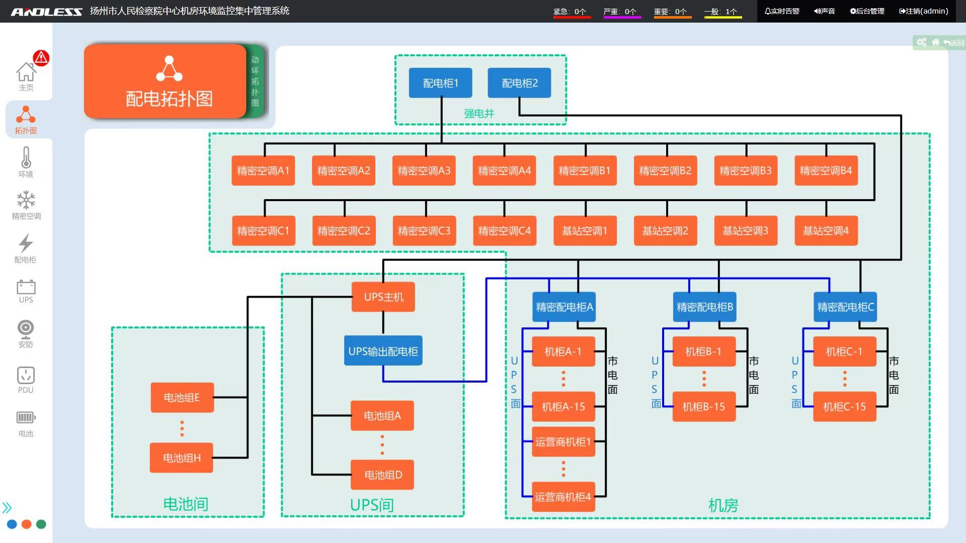 微模塊內(nèi)設(shè)備具備供電全鏈路顯示功能,可顯示從微模塊的總輸入到IT機(jī)柜的PDU,整個(gè)配電拓?fù)湔故鹃_關(guān)狀態(tài)、能量流圖、設(shè)備故障狀態(tài)、支路對應(yīng)關(guān)系、關(guān)鍵信號(hào)參數(shù)(電壓、電流、溫度等)。