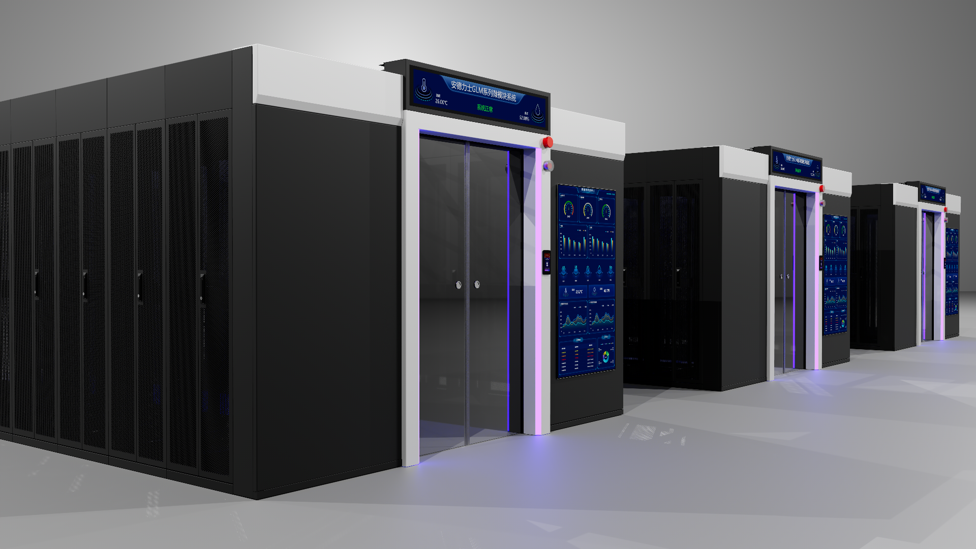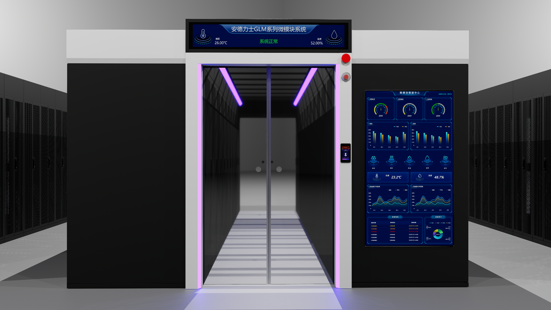 ◆ 易管理 :完善的監(jiān)控系統(tǒng),機(jī)房管理者對設(shè)備運行狀態(tài)能實時掌控,方便管理 。背景照明為三色氛圍燈,紅、藍(lán)、白,正常狀態(tài)為藍(lán)色氛圍燈,告警狀態(tài)為紅色氛圍燈。