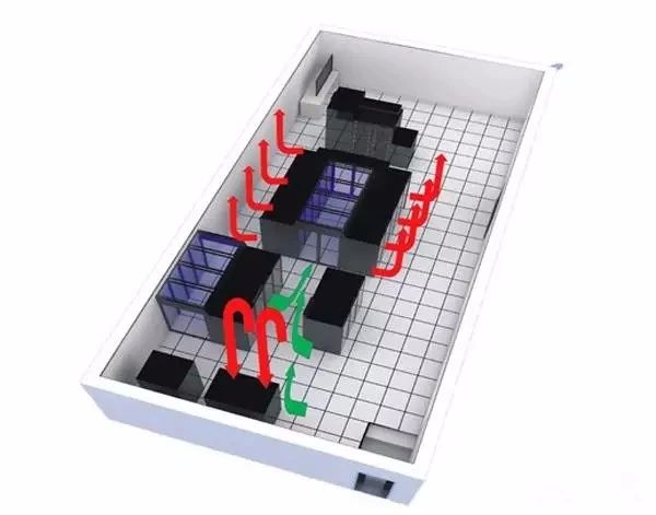 (1)機(jī)柜呈面對(duì)面排列,形成冷通道,出風(fēng)口在機(jī)柜面部的地板上。