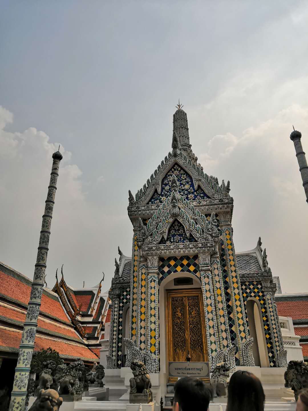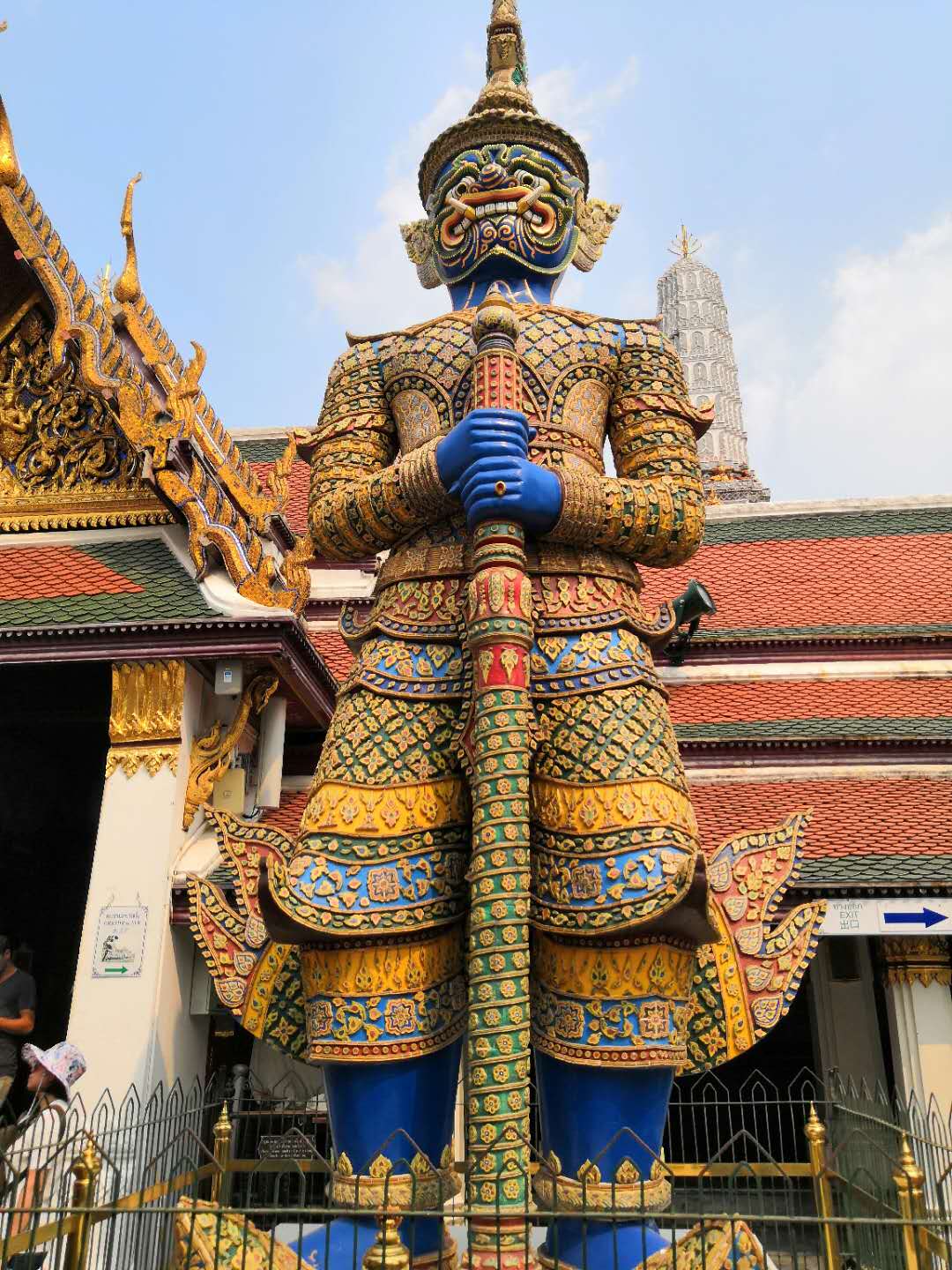 舉世聞名的大皇宮緊鄰著湄南河,是曼谷市中心內(nèi)一處大規(guī)模的古建筑群。走進大皇宮庭院,首先映入眼簾的是如茵的大片草地和姿態(tài)各異的古樹,草坪周圍栽有一些菩提樹和其它熱帶樹木。大皇宮的佛塔式的尖頂直插云宵,魚鱗狀的玻璃瓦在陽光照射下,燦爛輝煌。尖角高聳的廟宇、佛塔,在陽光的照耀下,玲瓏剔透、金玉璀璨,雕功細膩、精致美觀的高大金漆佛像、石雕和繪有泰國傳統(tǒng)圖案的壁畫,記載著與王國和佛教有關的故事。