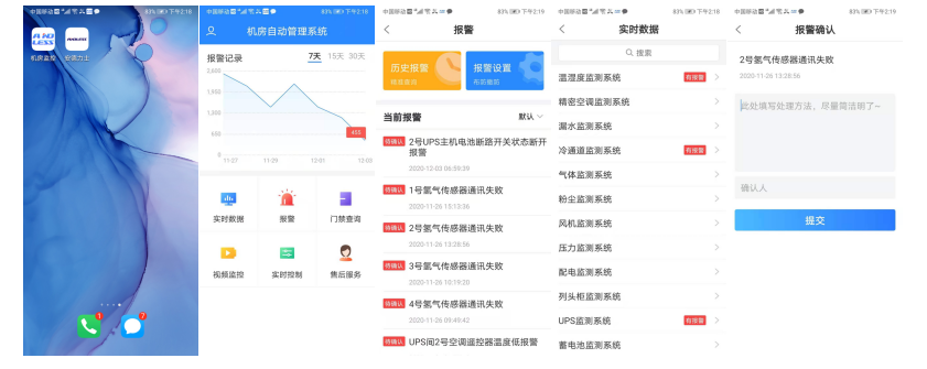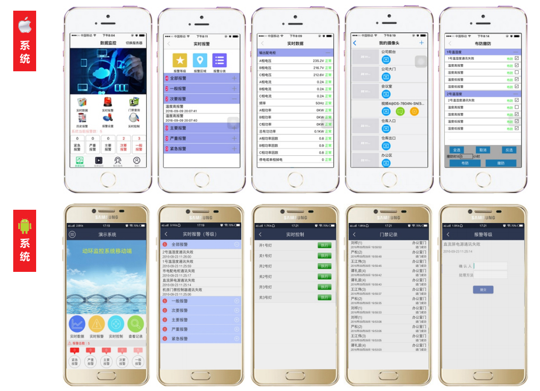 ◆手機(jī)APP移動(dòng)客戶端報(bào)警系統(tǒng):為便于實(shí)現(xiàn)機(jī)房的無人值守和遠(yuǎn)程管理,滿足客戶對(duì)移動(dòng)終端管理的需求,安德力士開發(fā)了移動(dòng)APP監(jiān)控系統(tǒng),實(shí)現(xiàn)機(jī)房所有監(jiān)控?cái)?shù)據(jù)的實(shí)時(shí)顯示和控制。監(jiān)控界面如下所示: