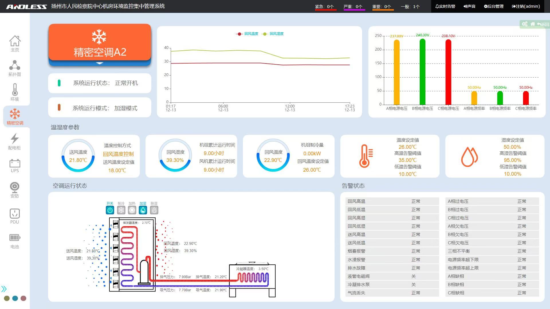 ◆手機(jī)APP移動(dòng)客戶端報(bào)警系統(tǒng):為便于實(shí)現(xiàn)機(jī)房的無人值守和遠(yuǎn)程管理,滿足客戶對移動(dòng)終端管理的需求,安德力士開發(fā)了移動(dòng)APP監(jiān)控系統(tǒng),實(shí)現(xiàn)機(jī)房所有監(jiān)控?cái)?shù)據(jù)的實(shí)時(shí)顯示和控制。監(jiān)控界面如下所示。
