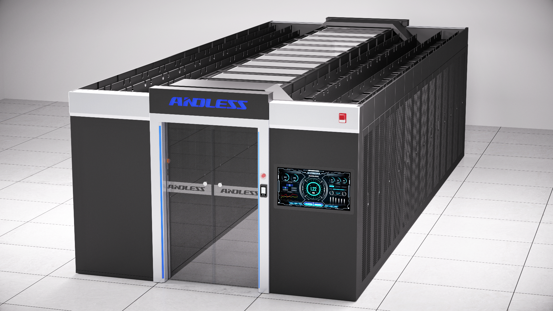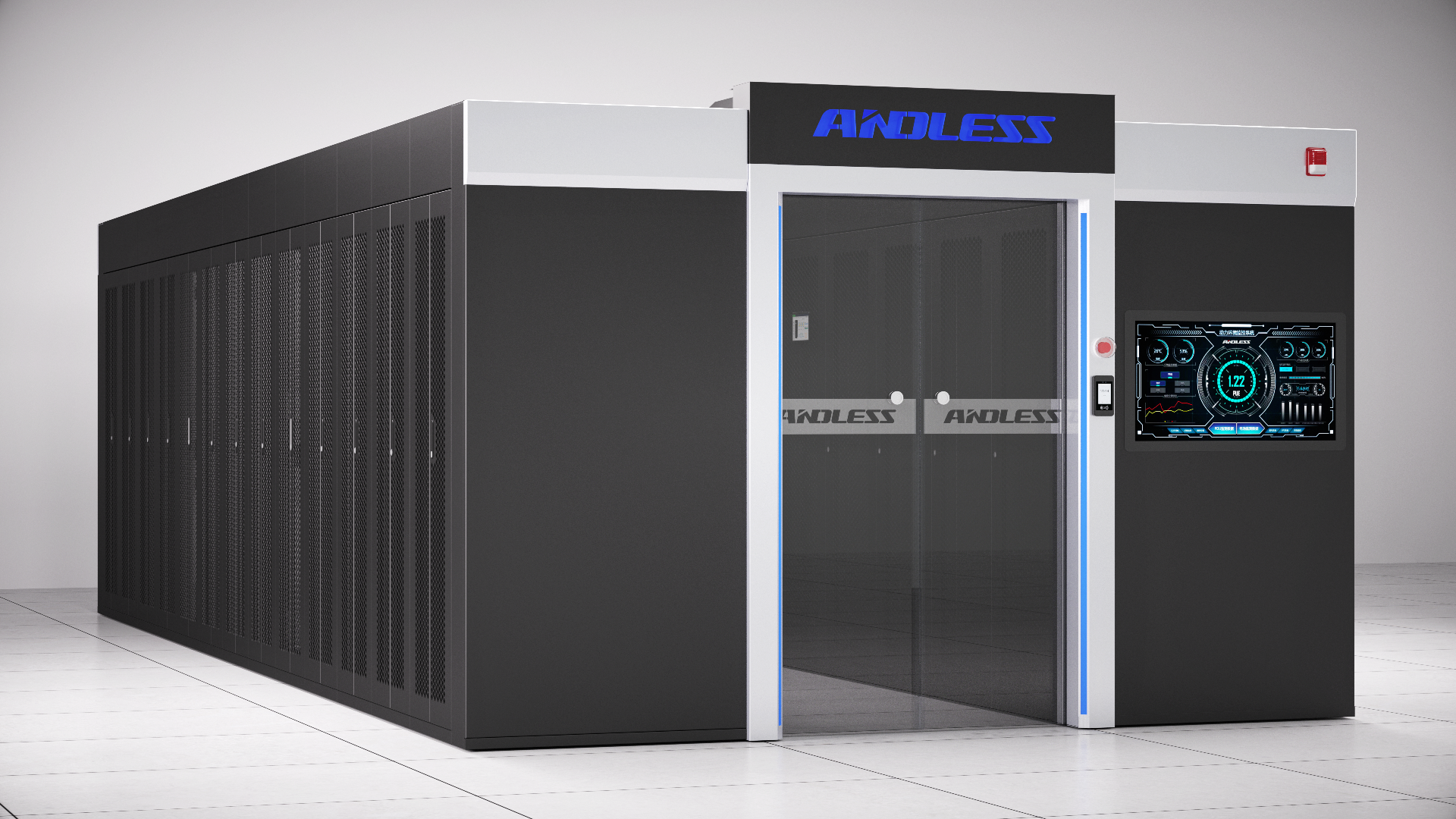 ◆ 易管理 :完善的監(jiān)控系統(tǒng),機(jī)房管理者對設(shè)備運行狀態(tài)能實時掌控,方便管理 。背景照明為三色氛圍燈,紅、藍(lán)、白,正常狀態(tài)為藍(lán)色氛圍燈,告警狀態(tài)為紅色氛圍燈。